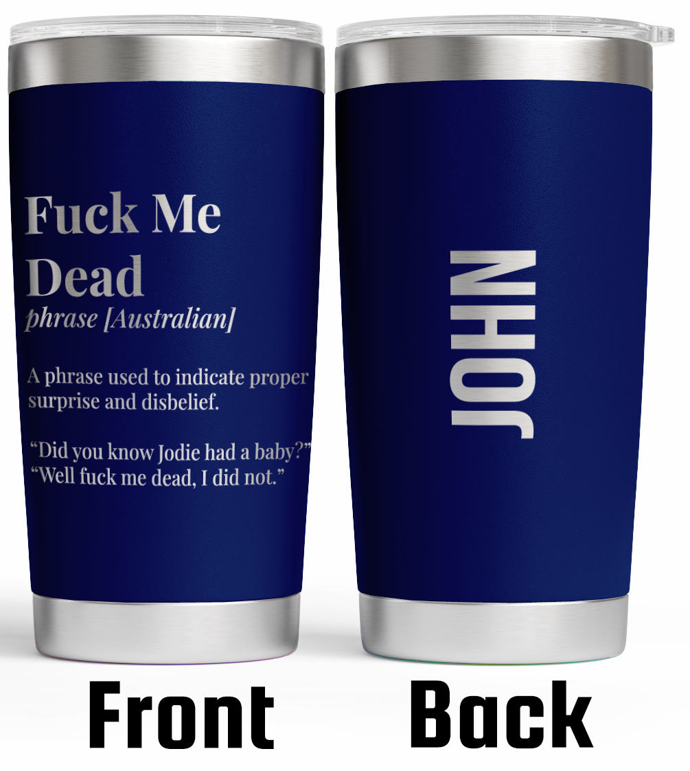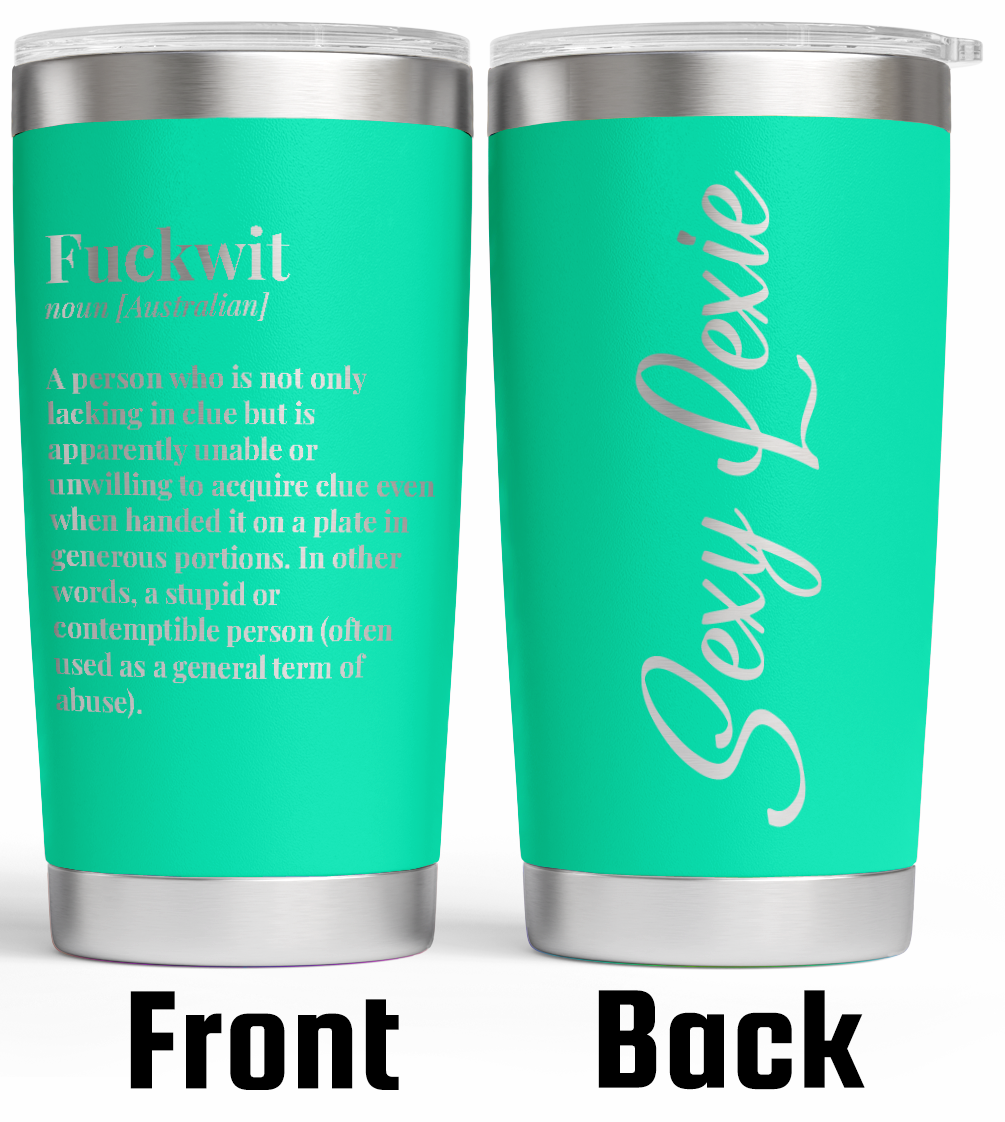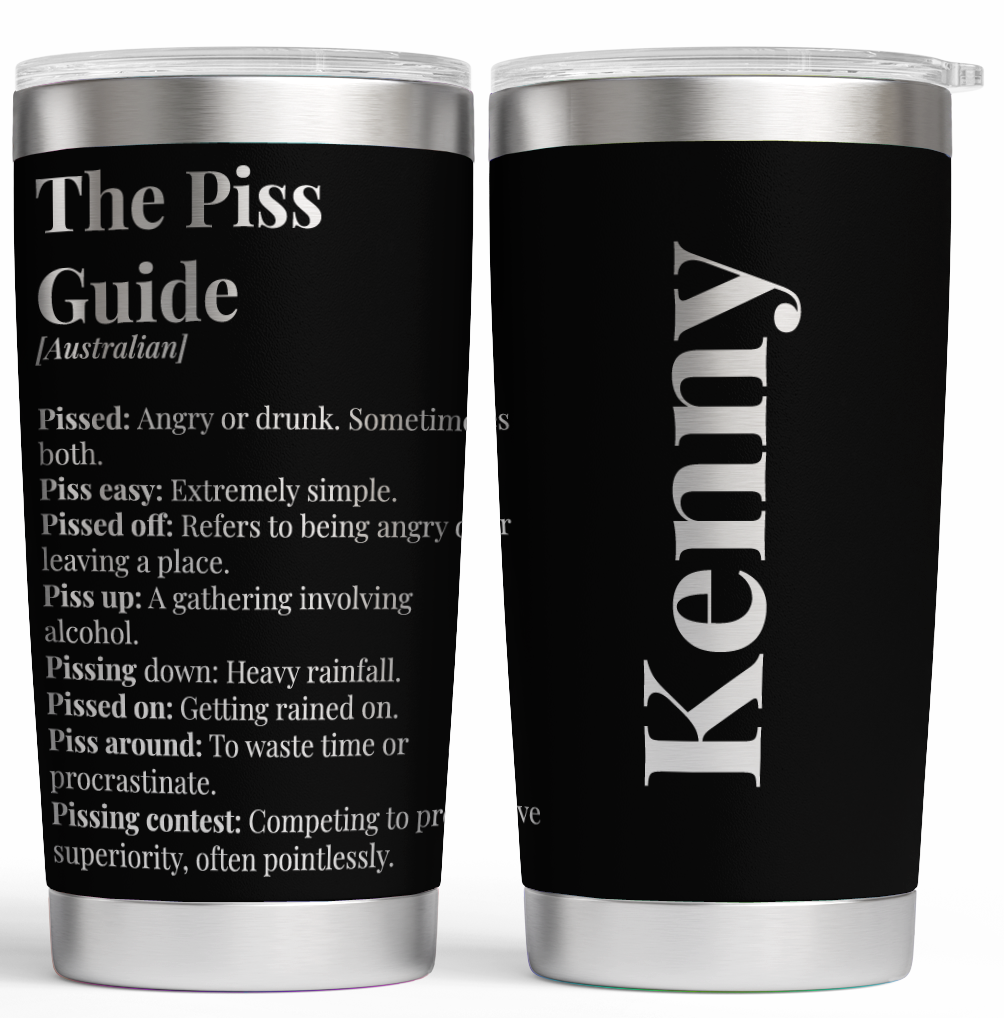 For those who appreciate a good laugh and a touch of Aussie humour, our personalised stainless steel tumbler is the perfect choice! Featuring the iconic definitions of “Fuckwit,” “The Piss Guide,” and “Fuck Me Dead” engraved on one side, this tumbler combines wit and practicality. Add a personal touch by engraving your name (or someone else’s) on the other side, available in a range of colours and fonts to suit your style.