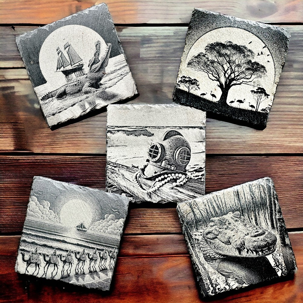 Please note the slate coaster images are a digital representation of the actual product. The slate has a natural texture and is dark grey in colour. Natural variation in colours does occur. Protect your surfaces in style with our elegant 10cm x 10cm square slate coasters. Each coaster is made from durable, natural slate, with each coaster engraved here in Broome with our own custom designs, adding a touch of sophistication to your home or office. The coaster’s unique, rustic texture and natural edge make it an eye-catching addition to any décor, while its sturdy design ensures long-lasting use. Benefits of Slate Coasters Packaging and Shipping All our slate coasters are packaged with bubble wrap of for four or more are posted in a sturdy carboard box. This will ensure your new slate coasters will arrive in perfect condition. Care Instructions To clean, simply wipe the surface with a damp cloth and mild soap if necessary. Avoid using abrasive cleaners or placing in the dishwasher to maintain the integrity of the engraving and the natural slate. This engraved slate coaster combines functionality and style, making it a perfect for the home or office.