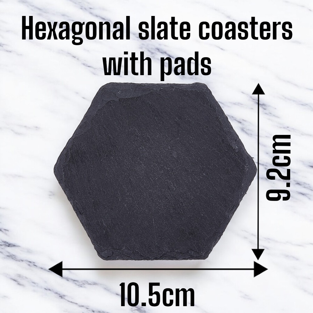 Elevate your table settings with our sleek and stylish personalised slate coasters. Made from natural slate, these coasters are not only functional but also exude a sophisticated charm, perfect for both personal and professional settings. Available in three versatile shapes—round, square, or hexagonal.